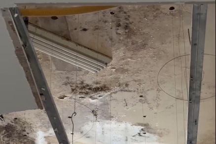 A estrutura cedeu após fortes chuvas, causando alagamentos e destruindo o forro.