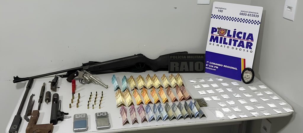 Em uma ação realizada pela Polícia Militar da 6ª Companhia Independente na cidade de Sapezal, um homem de 31 anos foi preso e um adolescente de 15 anos apreendido nesta quinta-feira. Eles são suspeitos de envolvimento em atividades criminosas, incluindo porte ilegal de armas de fogo e tráfico de drogas. Durante a operação, a polícia confiscou significativos itens ilegais, incluindo 43 porções de entorpecentes, duas armas de fogo, 61 munições, uma motocicleta e equipamentos utilizados para a fabricação de armas.