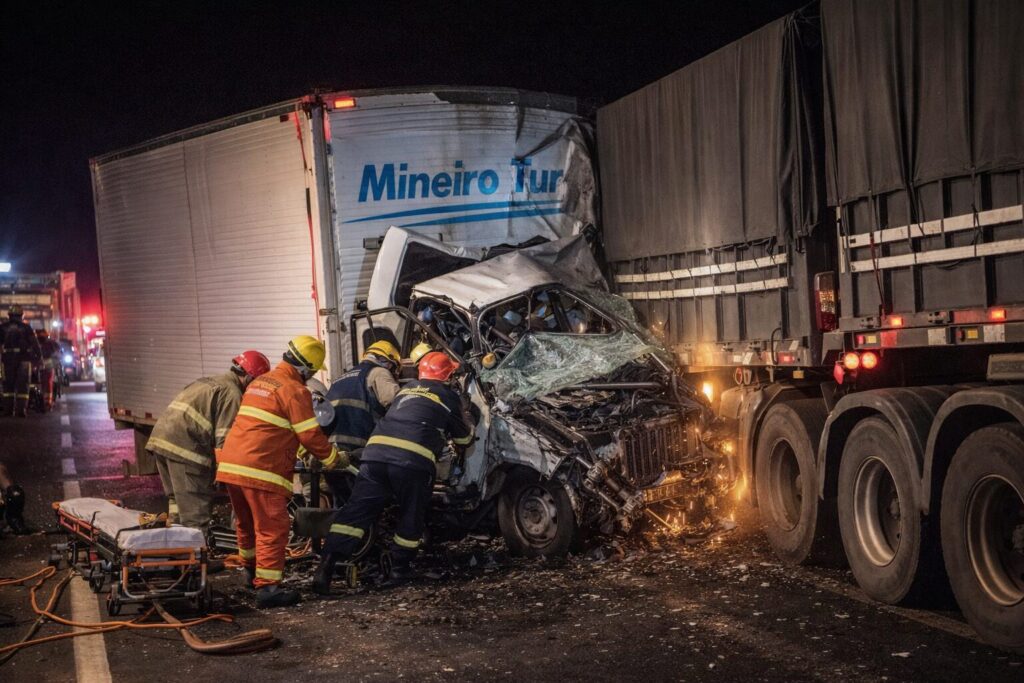 Um acidente de trânsito envolvendo um caminhão baú da empresa Mineiro Tur e uma carreta bitrem foi registrado na noite desta quinta-feira, por volta das 20h30, na BR-163, entre os municípios de Lucas do Rio Verde e Nova Mutum, no médio-norte de Mato Grosso. A colisão aconteceu nas proximidades do Posto Rodobrás, quase na entrada de Nova Mutum, e deixou o condutor do caminhão baú preso às ferragens, o que exigiu a atuação imediata das equipes de resgate. Segundo as informações apuradas no local, a carreta bitrem estava estacionada no acostamento da BR-163 quando o caminhão baú colidiu na parte traseira do veículo. Com o impacto, o caminhão da empresa Mineiro Tur sofreu danos significativos, enquanto isso, o motorista ficou preso à estrutura da cabine. Logo depois, equipes da concessionária Nova Rota do Oeste chegaram ao trecho e iniciaram os procedimentos de resgate.