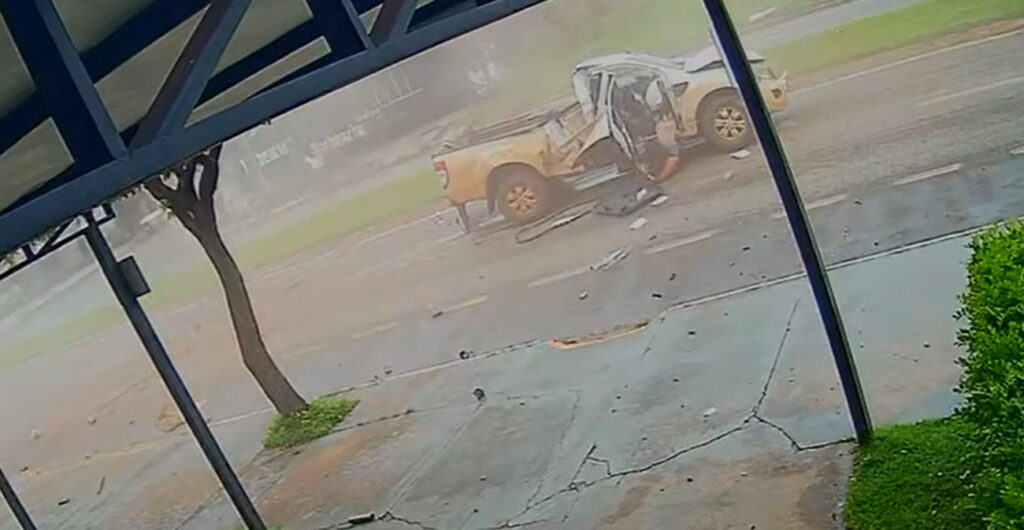 Jovem perde controle de caminhonete, destrói postes e deixa mulher em estado grave em Sorriso; veja vídeo