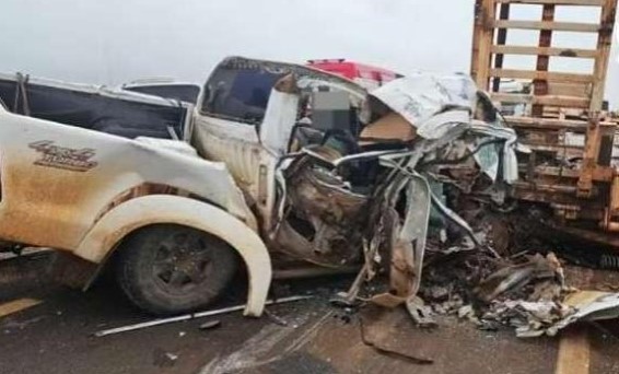 A caminhonete atingiu um caminhão estacionado parcialmente sobre a pista, em trecho sem acostamento.