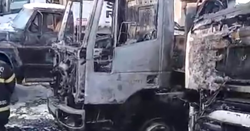 Pelo menos três caminhões e uma caminhonete foram destruídos pelo fogo.