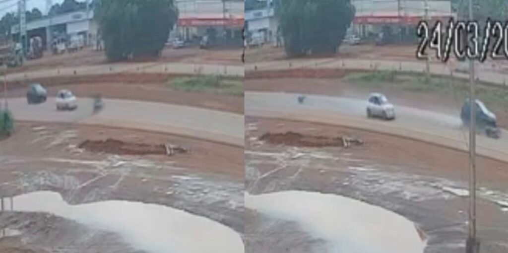 Uma câmera registrou um acidente envolvendo dois carros e uma motocicleta na manhã desta terça-feira (24), nas proximidades do Alto da Glória, em Sinop, enquanto uma mulher tentava atravessar a via e acabou envolvida na colisão entre os veículos, além disso o impacto derrubou a motociclista entre os carros e arrastou a moto por vários metros, portanto a cena chamou atenção pela intensidade da batida, assim mesmo após o impacto a mulher se levantou sozinha e deixou o local caminhando, enquanto isso o caso reforça os riscos constantes no trânsito urbano, por fim a ocorrência levanta alertas sobre segurança viária